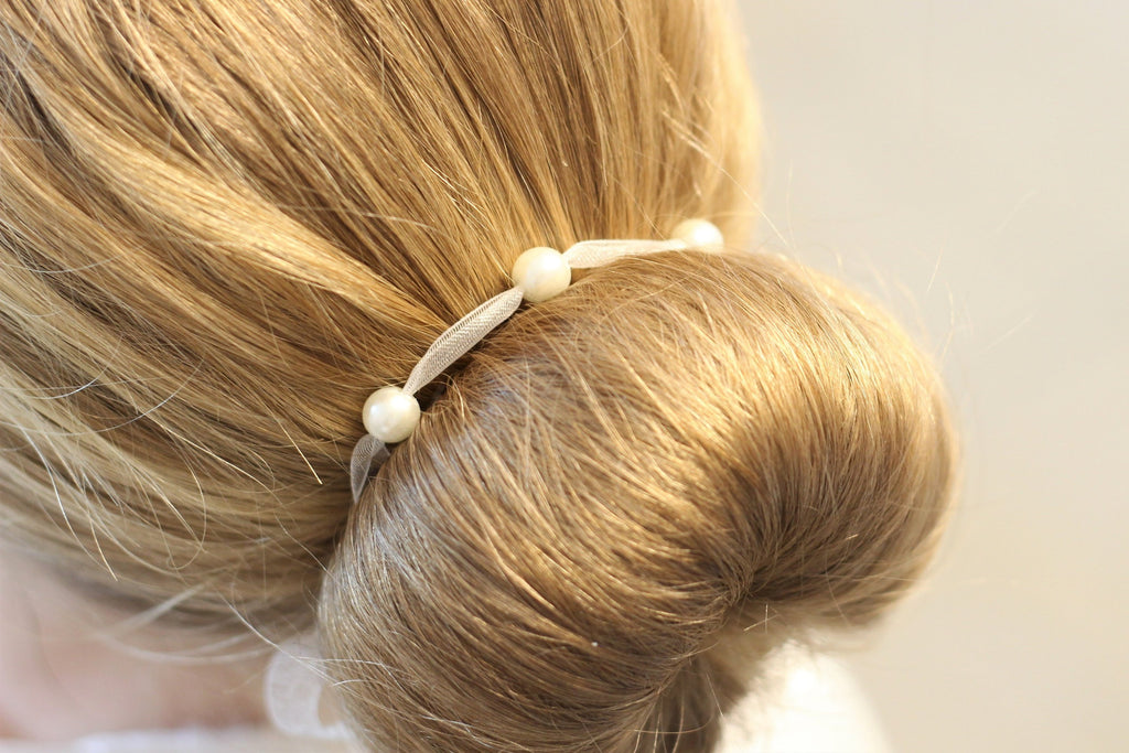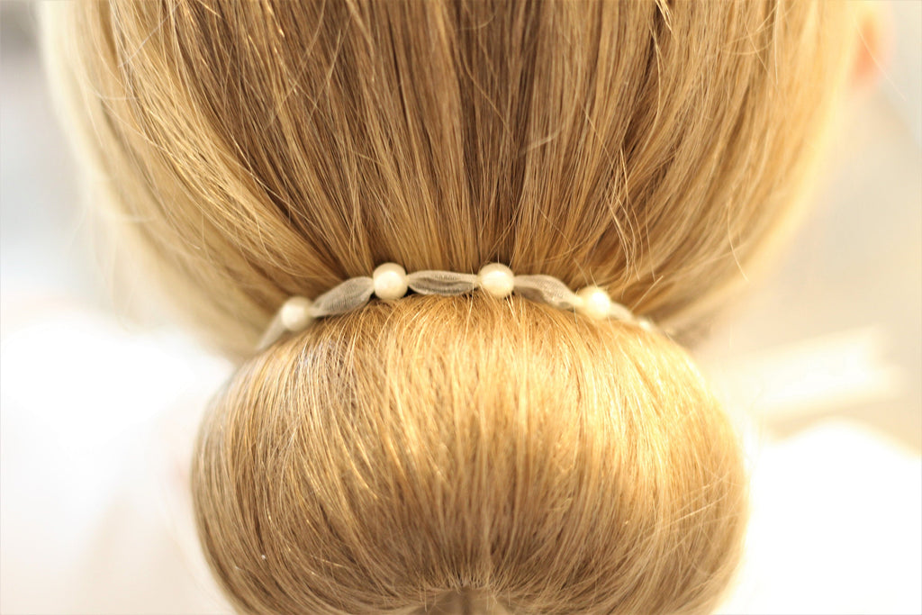 Dieses elegante Haarband in Ivory - Creme verleiht jedem Look eine feine, romantische Note. Ideal für Kommunion, Taufe, Blumenmädchen oder besondere Anlässe. Haarband mit 5 Perlen, aufgefädelt auf ein feines Chiffonband, unterstreichen den zarten Look. Ein besonderes Haar Accessoire für Konfirmation, Erstkommunion oder Hochzeit. Einfach in der Anwendung und kann mühelos im Haar oder am Dutt angebracht werden. Das Band um den Dutt legen, und die Enden am unteren Teil des Dutts zur Schleife binden. Du kannst das Duttband auch mit in eine Flechte oder Zopf einarbeiten, so kommen die Perlen nochmal besonders gut zur Geltung. Als kleiner Tipp, später kann der Haarschmuck auch als Armband getragen werden. Die Perlen kannst du nach belieben vorsichtig verschieben und so individuell an die Frisur anpassen.
