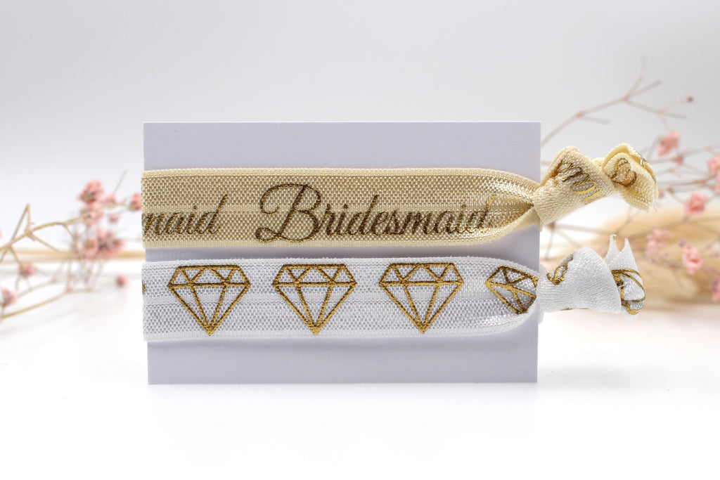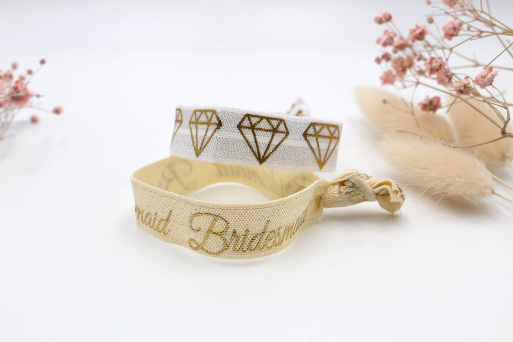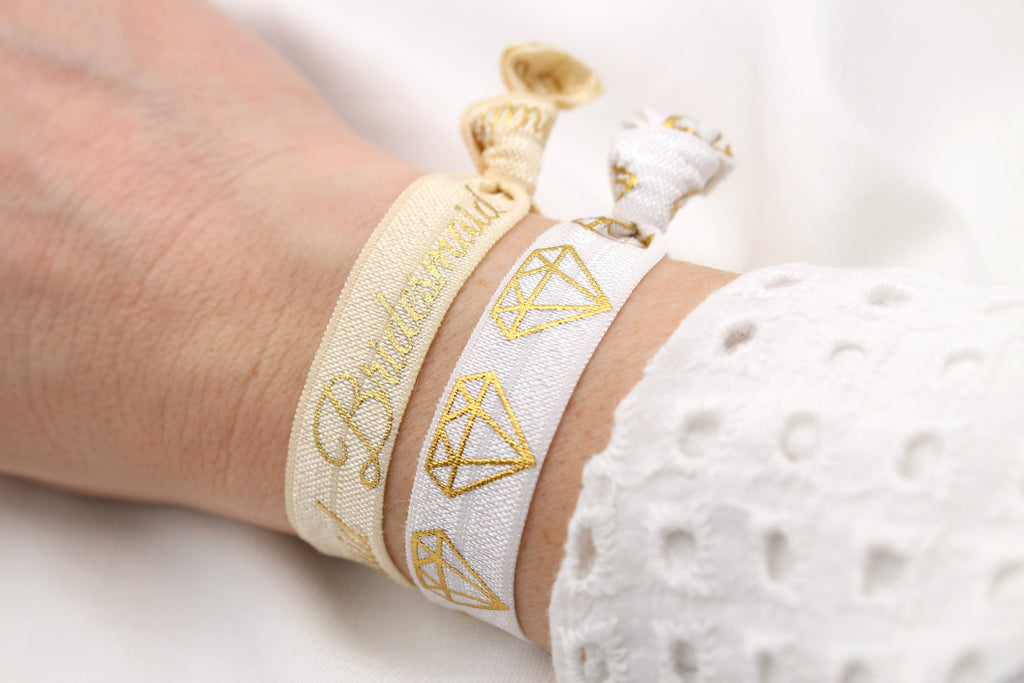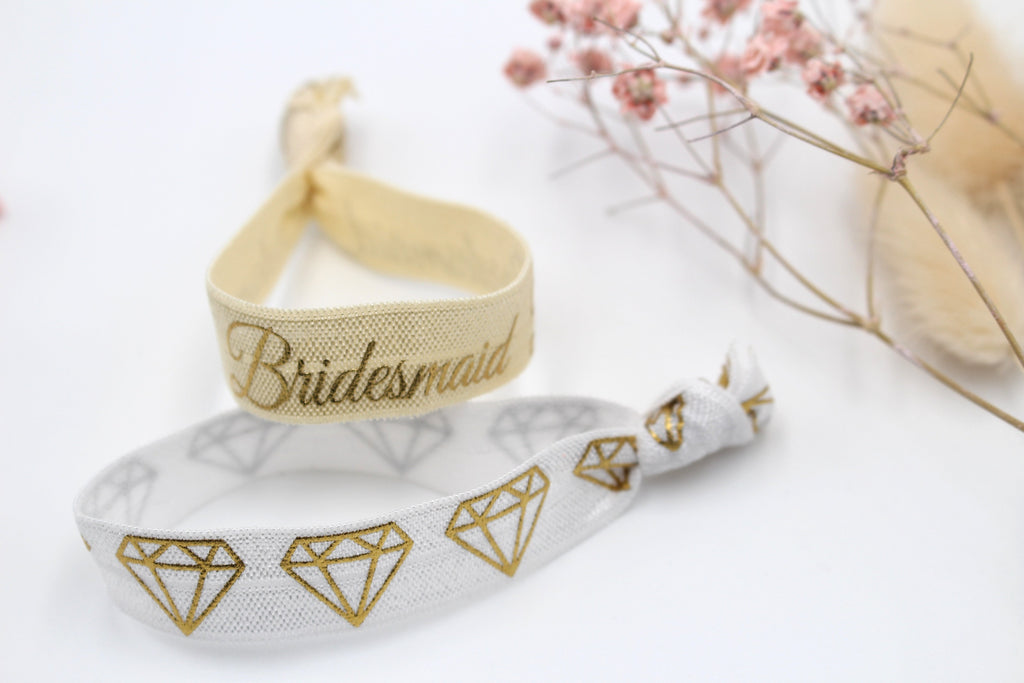 • Set besteht aus: 1 elastisches Armband in weiß mit goldfarbenem Schriftzug Bridesmaid und 1 elastisches Armband in creme mit goldfarbenem Druck als Diamant Symbols