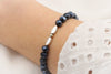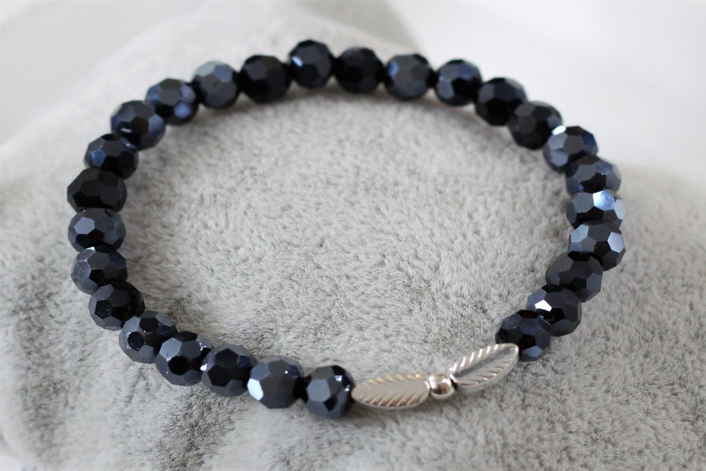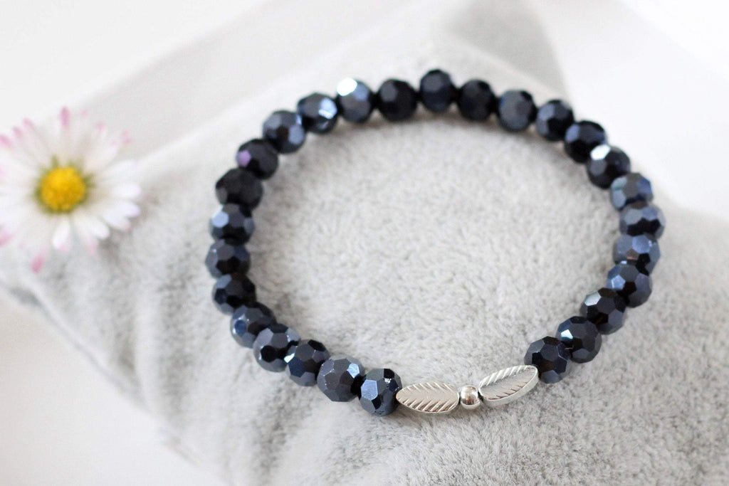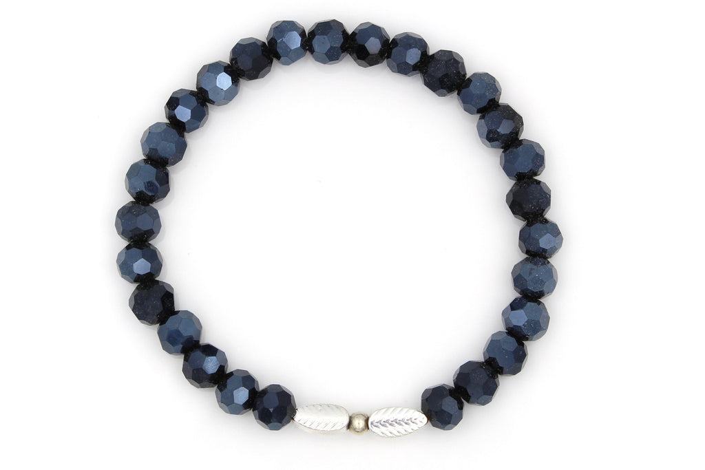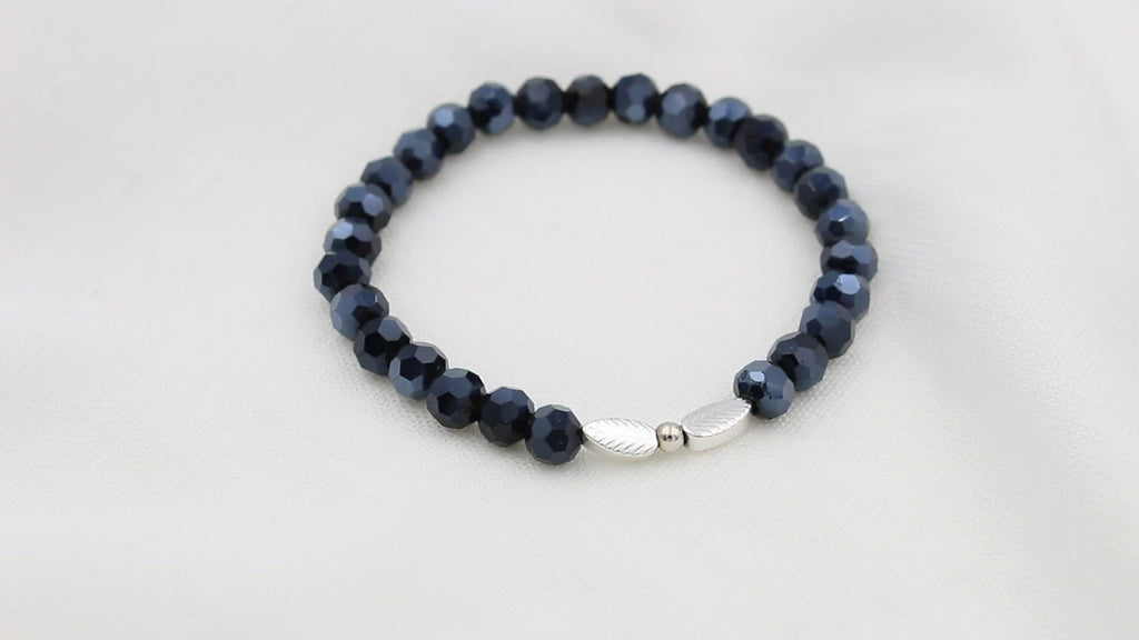 Ein glänzendes, blaues Perlenarmband für Damen mit silberfarbigen Blättern in der Mitte. Das Armband aus blauen Glas- Facettenperlen ist ein funkelnder Hingucker für jedes Handgelenk. Zwei filigrane Blättersymbol in silberfarben befindet sich Mittig und rundet das Perlenarmband für Damen perfekt ab. Durch das zeitlose Design passt das Schmuckstück zu jedem Alltagslook. Ob dezent und Casual zum Alltags Look mit Jeans oder glamourös für den Abend. Ein Allrounder unter den Perlenarmbändern.